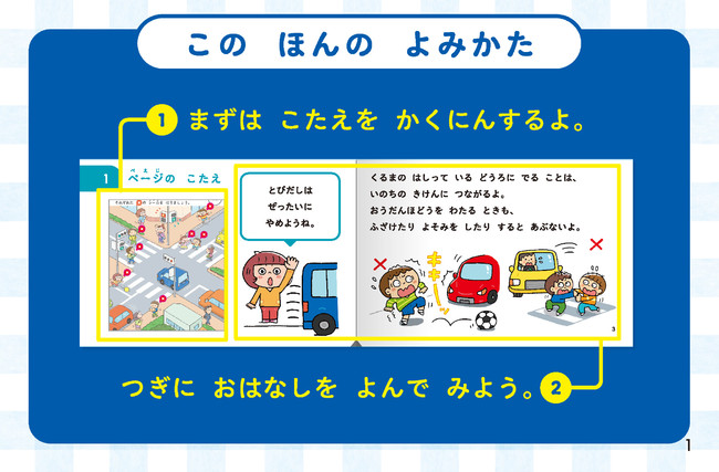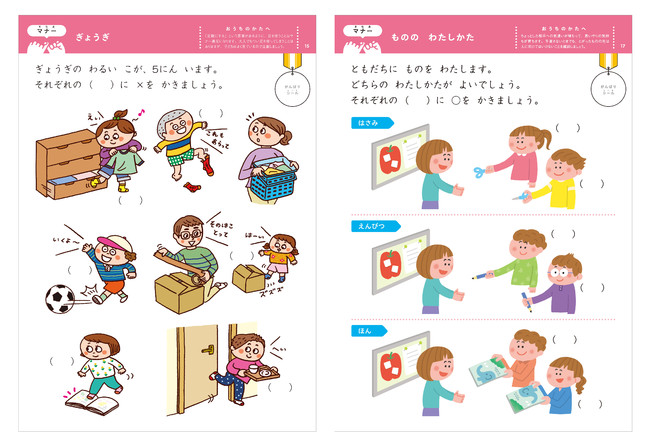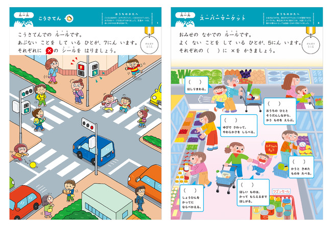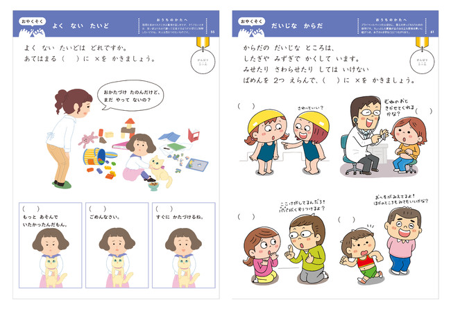 最初は身の回りのルールやマナーから、実生活に結びついた応用問題へ! 「ルール」「マナー」「防犯」「防災」「友だち」「おやくそく」の6つのテーマを学習します。