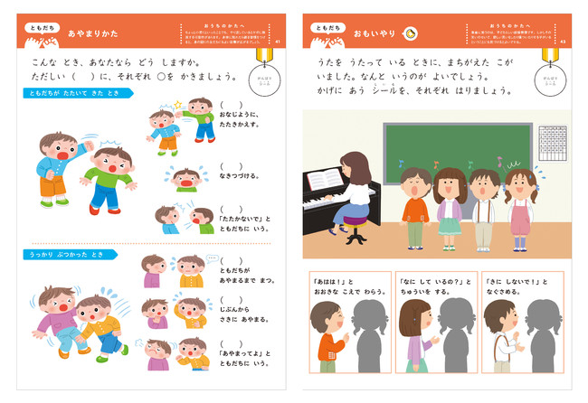「話の聞き方」「謝り方」「物の貸し借り」「思いやり」「自分の気持ち」「友だちの気持ち」「みんなの気持ち」など、友だちと仲よくする方法や自分の思いを伝える方法を学びます。