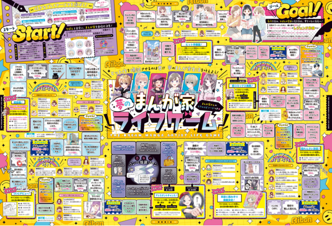 まんが家を目指して出版社に作品を持ち込んで、何度もボツになる暗黒時代を乗り越えて、夢にまで見たデビュー、アシスタント経験を積みながら初めての雑誌掲載、新連載、そしてついにヒット作爆誕――!! そんな「まんが家の人生」を追体験できるボードゲーム。りぼん期待の若手新人まんが家6名(朝海たいこ氏・神田ちな氏・虹沢羽見氏・みかづき唯氏・村山栞氏・優月うめ氏)による描きおろしイラストが使用されており、実際に神田氏とみかづき氏の新連載が9月号より、虹沢氏の新連載が10月号よりスタートします。紙製のボード上にはりぼんで活躍しているまんが家の皆さんの「投稿時代ツラかったこと」や「デビューしてうれしかったこと」などのリアルなコメントも入っており、記事としても長く楽しんでいただけます。ボードの大きさはタテ約60センチ×ヨコ約88センチ、学校机の2個分ほどのBIGサイズです。