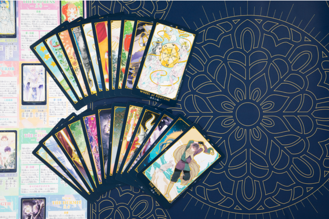 タロットカードの大アルカナ22枚をすべて、りぼんが誇る連載まんが家陣(朝香のりこ氏・いしかわえみ氏・香純裕子氏・木下ほのか氏・黒崎みのり氏・酒井まゆ氏・春田なな氏・村田真優氏)が描きおろし。さらに金の箔押しでより高級感のある仕上がりとなっています。「夢のまんが家ライフゲーム」のゲームボード用紙の裏がタロットクロスになっており、カードの意味と占い方法も載っているので、これさえあればどこでも占えます。