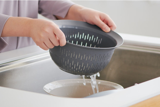 今回はほとんどのご家庭にある“ザル・ボウル”に着目し、料理のシーンがより快適になる商品を目標にして、開発しました。開発当初は米研ぎに特化した商品を目指し、楽に米研ぎができる形状の商品を試行錯誤したところ、その過程で、360度の大きなフチを付けてしっかり手で支えやすくすることで、混ぜる・こねる・水を切るなど、米研ぎ以外の調理も格段に楽になることに気付きました。調理のしやすさを持ちやすさでサポートし、時短にも繋がる今までにありそうでなかったザル・ボウルが完成しました。もちろん米研ぎの際の目詰まりのしにくさや、水切れの快適さにもこだわって開発をしています。