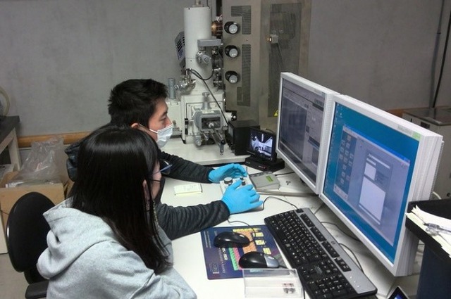 黒田教授の技術講習を受けSEM前処理,FE-SEMによる観察を行うインターンシップ学生
