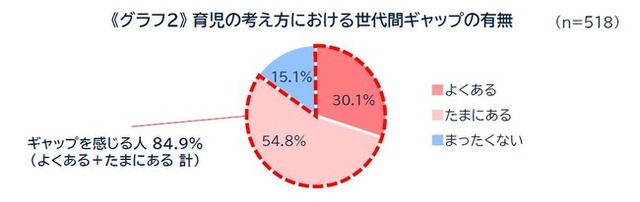 現役パパ・ママの8割以上(84.9%)が育児の考え方において世代間でのギャップを感じていました《グラフ2》。