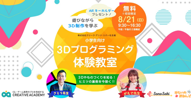 「C&R Creative Academy」は、未経験者のためのゲームクリエイター育成プログラムです。コースは、「3DCGキャラクターモデル」「3DCG背景モデル」「3Dモーション」「ゲームエフェクト」「After Effects(モーショングラフィックス)」「CGブラッシュアップ」(学生限定)「Game Engineer Academy」の7つあり、現役のゲームクリエイターたちが講師を務めています。これまで数多くの未経験者の方々を育成し、ゲーム業界への就業をサポートしてまいりました。そんな「C&R Creative Academy」では今回、夏休み特別企画として、3DCG教育支援事業などを展開する株式会社SonoSakiとのコラボレーションが決定。小学生を対象とした3DCGプログラミング教室を開催することとなりました。