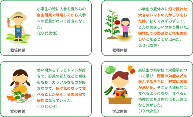野菜好きを対象に「野菜を好きになったきっかけ」を調査したところ「食べる」ことをはじめとする、様々な野菜との触れ合い体験があることがわかりました。