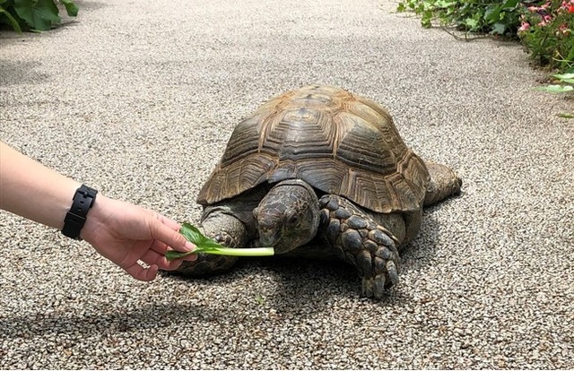 サンシャイン水族館では野菜と合わせて野草も与えることで、長期的に見た際の病気のリスク低減やカメに食事の選択の余地を作ることを意識しています。当館で飼育しているビルマホシガメは小松菜が大好物です。