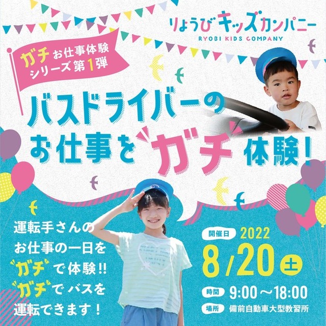 両備グループ(事務局:岡山県岡山市北区下石井二丁目10番12号 杜の街グレース オフィススクエア5階、グループ代表兼CEO:小嶋光信)の両備ホールディングス株式会社(所在地:岡山県岡山市北区下石井二丁目10番12、代表取締役社長:松田敏之)は、9月18日(日)に、備前自動車大型教習所(所在地:岡山県備前市浦伊部1185-15)で小学生のお子様向けのお仕事体験イベント“ガチ”お仕事体験シリーズ第1弾~バスドライバーのお仕事を“ガチ”体験~を開催いたします。