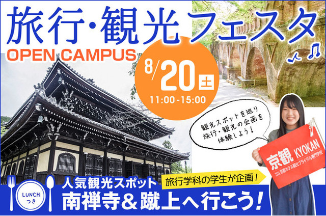 京都ホテル観光ブライダル専門学校は、2022年8月20日(土)にオープンキャンパス「旅行・観光フェスタ」を開催します。今回は、初めて旅行学科の学生が企画した、京都の人気観光スポットである「南禅寺」「蹴上」へ行くイベントです。学生がツアーコンダクターとして参加者の皆様をご案内します。おいしい京都にちなんだお弁当やお菓子をご用意しています。旅行・観光や、京都の魅力について感じていただける機会を提供いたします。