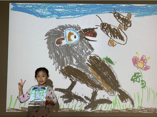 賞をもらえて嬉しく思いました。「とべ!ヒヨドリのピーコ」を選んだ理由は、目が可愛いから選びました。絵を描いているときは、羽を上手に描こうと気を付けました。これからも絵が好きなのでたくさん描きたいです。