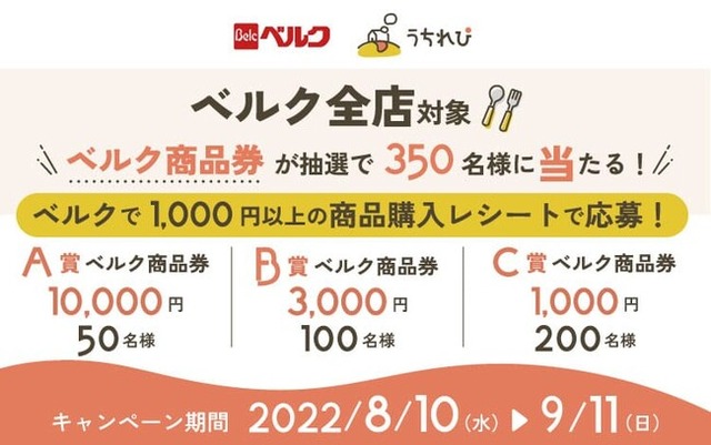 今回、埼玉・群馬・千葉県を中心に関東で地域密着型のスーパーマーケットを運営するベルクの協力の元、キャンペーンを実施する運びとなりました。ベルクで1,000円(税込)以上の商品を購入したレシートの画像を「うちれぴ」アプリから専用キャンペーンサイトにアクセスし応募すると、抽選で商品券が合計350名様に当たります。日々の食料品のお買い物にお使いいただける商品券をプレゼントすることにより、「うちれぴ」アプリの普及促進を図ります。