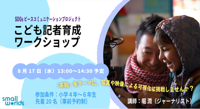 世界最大級の屋内型ミニチュア・テーマパーク「スモールワールズ TOKYO」(以下、スモワル)は、今夏開催のイベント『わくはぴ 夏☆キッズプログラム』に加え、2022年8月17日(水)に「こども記者育成ワークショップ」を開催します。講師は、SDGs ピースコミュニケーションプロジェクト ボードメンバーの堀潤氏(ジャーナリスト)!「平和」をテーマに、写真や映像による可視化に挑戦します。さらに、参加者から「こども記者キッズアンバサダー」を任命します!