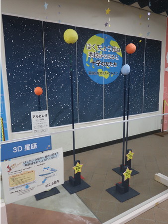 視聴覚教育センターの一階では、無料で遊べる常設の展示も人気。望遠鏡をのぞいて見られる3D星座やピタゴラ装置、VRを使用した星の集まる装置など、子どもたちが実際に触れて動かせる展示が多いのが印象的です。