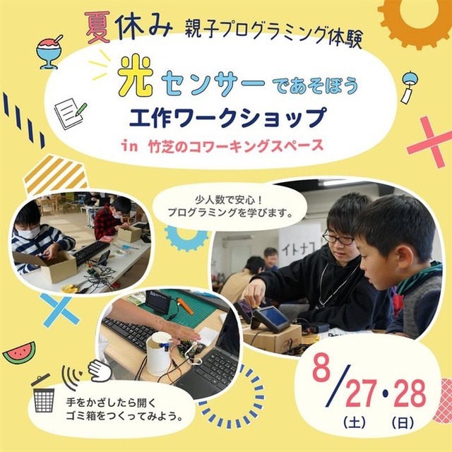 本イベントは、少人数での実施のため安心してプログラミングが学べるほか、プログラミング用パソコン「IchigoJam」を使用し、プログラミングの基礎を学んだうえで、応用として光センサーを使った「手をかざすと開くIoTゴミ箱」の制作体験をしていただきます。