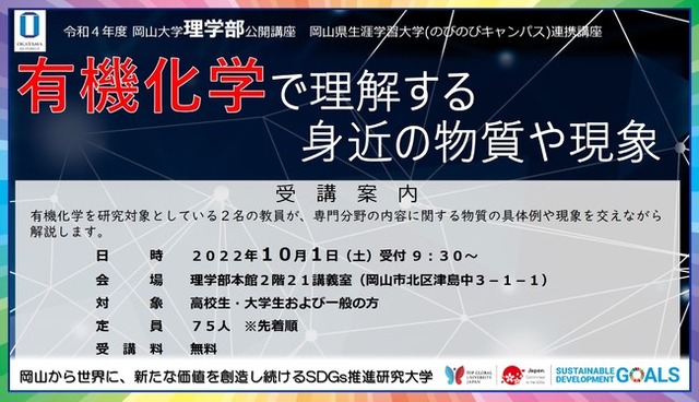 国立大学法人岡山大学(本部:岡山市北区、学長:槇野博史)理学部では、公開講座「有機化学で理解する身近の物質や現象」(岡山県生涯学習大学(のびのびキャンパス)連携講座)を2022年10月1日(土)に本学津島キャンパス(岡山市北区)の理学部本館で開催します。