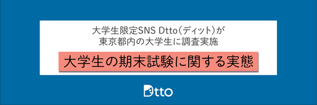 大学生向けSNS「Dtto(ディット)」(https://www.dtto.com/)を運営するDtto株式会社は、大学生(※1)を対象に期末試験および試験対策に関するアンケート調査を行いました。半数以上の大学生が対面形式で期末試験を受けており、オンライン試験の実施割合を既に超えていることがわかりました。また、試験期間中には睡眠時間の不足に悩む学生が多く、勉強時間の確保のために睡眠を犠牲にする学生が多いことが判明いたしました。