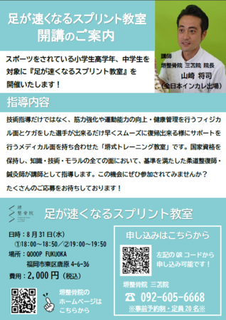 堺整骨院グループが行う「堺式 足が速くなるスプリント教室」は、スポーツをされている小学生高学年と中学生対象に行われます。