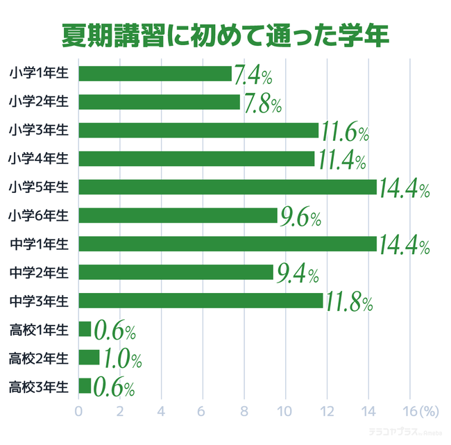 塾の夏期講習に初めて通った学年は、小学5年生と中学1年生がもっとも多く、14.4%。勉強の難しさが一段と上がる小学5年生と、小学校から中学校へ進学した節目のときに、考え始める家庭が多いようです。