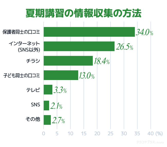 また、どのように情報を集めているか尋ねたところ約3割(34.0%)が「保護者同士の口コミ」と回答しており、「インターネット(SNS以外)」(26.5%)では塾のホームページや塾の口コミサイトを利用しているようです。