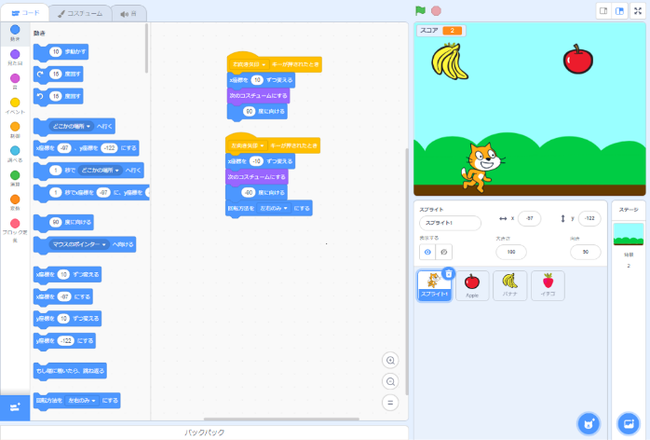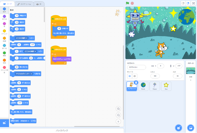 今回のイベントでは、MIT(マサチューセッツ工科大学)メディアラボで開発されたビジュアルプログラミング言語、「Scratch(スクラッチ)(注2)」を使ったプログラミング体験ができます。動作が書かれたブロックをつなげていくことで、簡単なものから複雑なものまで自分だけのゲームやアニメーションをプログラミングすることができます。