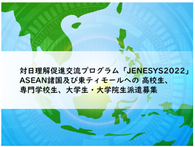 JICEでは、日本国政府(外務省)が推進する人的交流事業である対日理解促進交流プログラム「JENESYS2022プログラム」のASEAN諸国及び東ティモールへの高校生、専門学校生、大学生・大学院生対象の派遣プログラムを実施することとなりました。詳細は下記及び募集要項をご覧ください。国際交流に興味のある方、日本の魅力を各国の人々に紹介したい方、将来国際協力や海外と繋がる仕事に関心のある方など、意欲がある方からのご応募を心よりお待ちしております。
