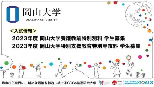 国立大学法人岡山大学(本部:岡山市北区津島中、学長:槇野博史)では、「2023年度岡山大学養護教諭特別別科」と「2023年度岡山大学特別支援教育特別専攻科」の学生募集を以下の日程で行います。出願を希望される方は下記をご参考ください。