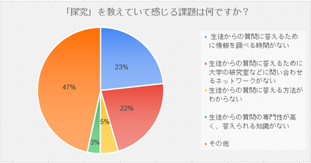「探究」の指導経験がある301人のうち、「探究」を教えていて感じる課題で最も多かったのは「生徒からの質問に答えるために情報を調べる時間がない」で23%でした。次いで22%が「生徒からの質問に答えるために大学の研究室などに問い合わせるネットワークがない」と答えました。「生徒からの質問に答える方法がわからない」も5%いて、教員だけで生徒の質問に答えることに負担を感じる教員が多いことが明らかになりました。
