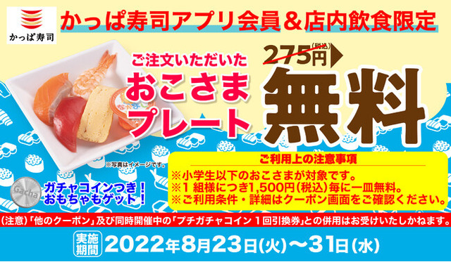 ・内容:小学生以下のおこさま対象、店内飲食にて「おこさまプレート(ガチャコイン付)」をご注文いただき、お会計時にかっぱ寿司アプリ内の該当クーポンをご提示いただいた方へ、税込275円の「おこさまプレート(ガチャコイン付)」を無料でご提供いたします。〈例:3,000円(税込)以上のご利用の場合2皿分が無料となります。〉