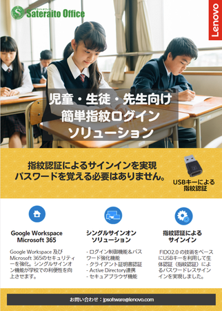 しかし、1つの ID・パスワードで様々なクラウドサービスを利用することは、セキュリティ面で懸念があります。そこで、 Sateraito Office Single Sign-Onは、AuthenTrend社のオンデマンドFIDO2クラウド(AT.AuthiFi)と連携し、Lenovo社の教育用 PCにATKey.Pro(指紋認証対応FIDO2認証システム)を搭載し、生徒や教師はUSB キーに指紋をタッチしてパスワードを覚えることなくログインできるようにしました。