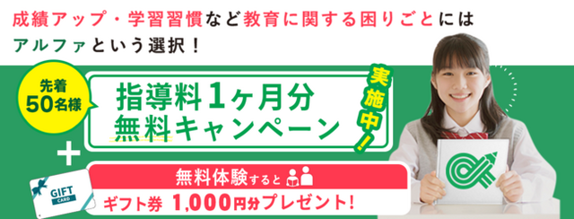 プロ講師による完全オーダーメイド指導の家庭教師や個別教室。勉強ぎらい克服・学習習慣付け・成績アップ・受験対策など、1対1の完全個別指導でお子さまの「できたを増やす」株式会社アルファコーポレーション(本社:東京都豊島区、代表取締役:吉田俊泰)では、現在指導料が最大1ヶ月分無料になるキャンペーンを実施中です!