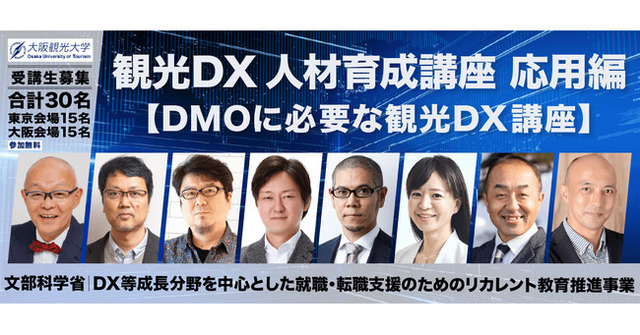 大阪観光大学(所在地:大阪府熊取町、学長:山田良治)は、文部科学省「DX等成長分野を中心とした就職・転職支援のためのリカレント教育推進事業」を受託し、DMOなどアフターコロナの観光需要を獲得するために必要な観光DXを学ぶプログラム「観光DX人材育成講座 応用編(DMOに必要な観光DX講座)」( https://tourism-lab.jp/cooperation/2022/ )を始動、本日2022年8月24日(水)より申込の受付を開始します。