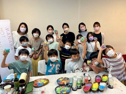 最後には、出来上がったキャンドルを働いているママ達に見せに行き、誇らしげな様子で記念撮影をして、ワークショップは終了となりました。