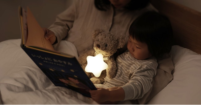 ぬいぐるみに取り付けて、絵本を照らす星型のライト。お子様のお気に入りのぬいぐるみ(対応サイズ: 首回り約15~25cm)の首にシリコーンのベルトを取り付け、本体裏側の電源ボタンを押すとライトが点灯。電球色のあたたかい光で絵本を照らし、おやすみ前の心地よい時間を演出します。ライトが点灯する表側は、やわらかいシリコーンのカバーで肌当たりを優しくしました。お子様がぬいぐるみと一緒にライトを抱きしめても安心です。