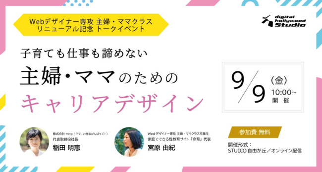 講座のリニューアルにあたり、記念トークイベント「子育ても仕事も諦めない。主婦・ママのためのキャリアデザイン」を9月9日に開催します。STUDIO自由が丘、オンライン、いずれかお好きな方法でご参加いただけます。