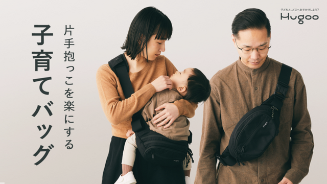 Hugoo(ハグー)は、子育て中のパパ・ママが、自分の体験をもとに、同じ悩みをもつパパ・ママに向けて開発をした“抱っこサポートや収納性といった機能性がありながら、日常使いもしやすいヒップシート付きのショルダーバッグ”です。