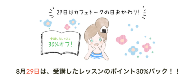 「カフェトークの日」とは、日本最大級オンライン習い事サイト「カフェトーク」が毎月19日と29日に実施している30%ポイントバックキャンペーンです。