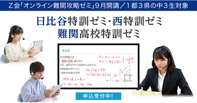 株式会社増進会ホールディングス(Z会グループ)のグループ会社である株式会社Z会は、「Z会の通信教育」中学生向けコースにおいて、都立日比谷高校・都立西高校および東京都・神奈川県・埼玉県・千葉県の公立トップ高校をめざす中3生を対象とするオンライン難関攻略ゼミ「日比谷特訓ゼミ」・「西特訓ゼミ」・「難関高校特訓ゼミ」を9月から開講(少人数制・先着順)します。(2022年8月2日より予約受付中。)