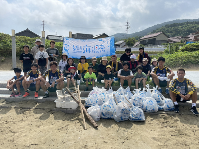 海と日本プロジェクトinしまね実行委員会は、JFL所属のサッカーチームFC神楽しまねとのコラボレーションで、8月13日(土)に松江市の古浦海水浴場で、海岸清掃とビーチサッカーをかけ合わせたイベントを開催しました。イベントでは、FC神楽しまねの選手と参加者が海岸清掃を実施後、きれいになった海岸で、選手と子どもたちがドリブルリレー対決で汗を流しました。