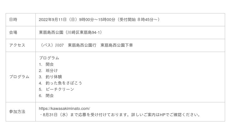 川崎みなと祭り実行委員会は、2022年9月11日(日)に東扇島西公園にて親子海釣り教室を開催いたします。この「親子海釣り教室」は、次世代へ海を引き継ぐために、海を介して人と人とがつながる“日本財団「海と日本プロジェクト」”の一環です。