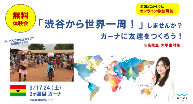 株式会社WTOC(ウトック)(本社:東京都渋谷区 代表取締役:堂原有美)は世界42ヶ国130以上の団体と連携し、世界と日本の教室をオンラインで繋いで同世代が交流できる場をつくる「教室から世界一周!」プロジェクトを進行中。このたび、全国どこからでもオンラインで個人参加できる海外交流の無料体験会を開催します。
