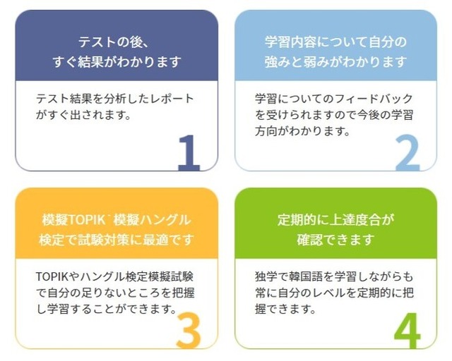 テストには、現在の自分のレベルを確認できる「レベルテスト」、初級から中上級までの「級別テスト」、講師と会話をしながら行う「会話テスト」、「TOPIKやハングル検定の模擬テスト」があります。