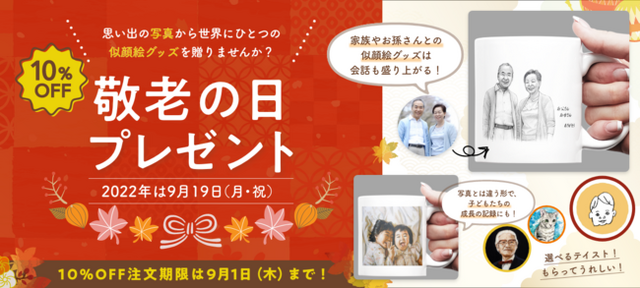写真から似顔絵ギフトをお届けするWEBサービス「Creator's Gift」(https://creatorsgift.myshopify.com/)では、敬老の日ギフトキャンペーンとして、9月1日(木)までのご注文はもれなく表示価格より10%割引を実施します。