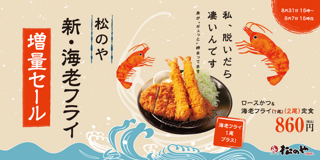 株式会社松屋フーズ(本社:東京都武蔵野市、代表取締役社長:瓦葺 一利)では、とんかつ専門店の「松のや・松乃家」におきまして、2022年8月31日(水)午後3時より、「新・海老フライ増量セール」を開催いたします。