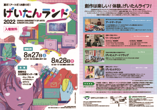 大阪芸術大学短期大学部(所在地:兵庫県伊丹市/学長:塚本 英邦)は、2022年8月27日(土)・28日(日)に宝塚市立文化芸術センター1階にて、高校生・中学生のための大グループ展『げいたんランド』を開催いたします。