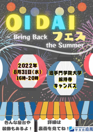 追手門学院大学(略称:追大、大阪府茨木市、学長:真銅正宏)は8月31日(水)に、夏休み期間中のキャンパスを会場に、子どもを中心に地域の住民が参加できる夏祭りイベントを開催します。