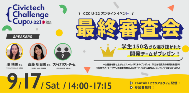 一般社団法人コード・フォー・ジャパン(Code for Japan、代表:関治之)は、22歳以下を対象とした学生向けプロトタイプ開発コンテスト「Civictech Challenge Cup U-22」(以下、CCC U-22)において、勉強会、ハンズオン、メンタリングを実施しており、9月17日の最終審査会では一次審査を通過した8つの学生チームが制作したプロトタイプ作品が発表される予定です。