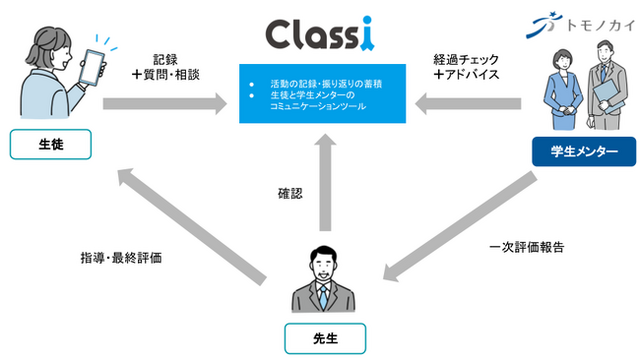 トモノカイが派遣する学生メンターはこれまでも、「Classi(クラッシー)」を活用した放課後の学習支援を行ってきました。今回の連携では新たに生徒たちの探究活動を支援します。学生メンターが学習の経過をチェックし、アドバイスした内容をClassiに登録、生徒も質問や相談内容を書き込み、コミュニケーションをとりながら指導内容の記録を蓄積します。それを先生が確認し、学生が一次評価した内容を先生に伝え、それをもとに先生が生徒に指導や最終評価を行います。