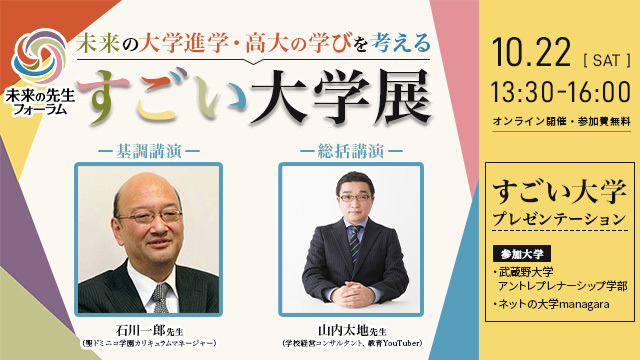 未来の先生フォーラム(旧・未来の先生展)実行委員会(東京都新宿区、実行委員長:宮田純也)は、令和4年10月22日(土)13:30より「すごい大学展vol.2-未来の大学進学を考える-」(https://sugoi-univ2.peatix.com/ )をオンライン・参加費無料にて開催することを発表します。