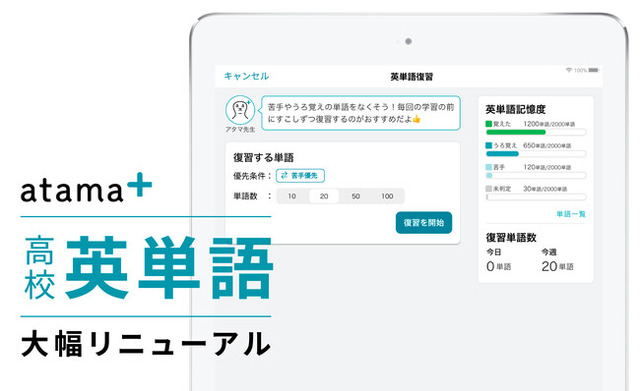 atama plus株式会社(本社:東京都港区、代表取締役CEO:稲田 大輔、以下「atama plus」)は、2022年8月31日より、AI教材「atama+」の高校生向けの英単語学習機能をリニューアルしました。AIによる記憶度判定と5段階から選べるレベル設定によって、今までよりもさらに生徒一人ひとりに合わせた学習が可能となります。