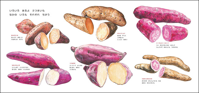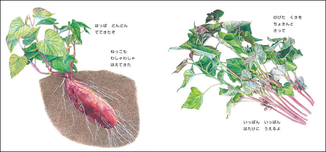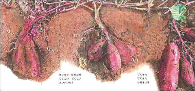 実際にはなかなか見ることができない、土の中でさつまいもが育っていく様子が描かれます。