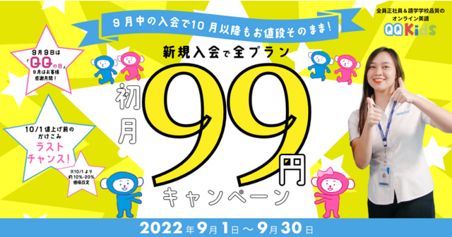 株式会社QQ English (本社:東京都渋谷区、代表取締役:藤岡 頼光)は、提供するオンライン英会話サービス「QQ English」「QQキッズ」にて、2022年9月中に新規入会された方を対象に「全プラン初月99円キャンペーン」を実施することをお知らせいたします。
